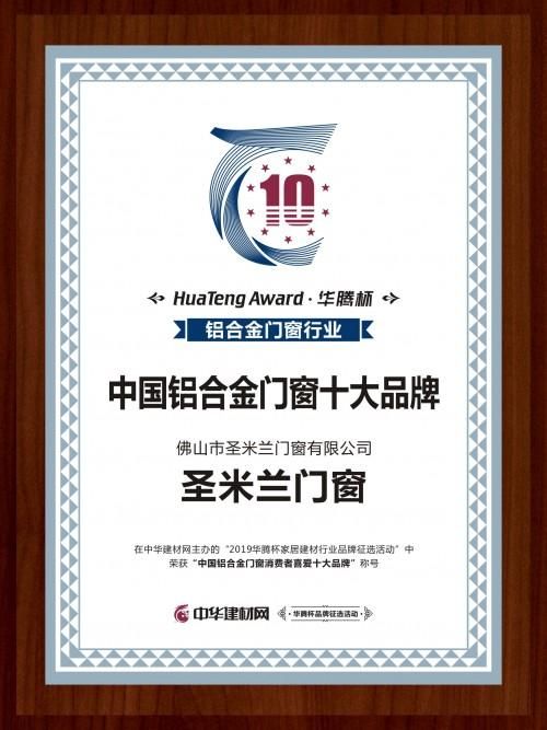 圣米兰门窗荣获2019中国铝合金门窗消费者喜爱十大品牌