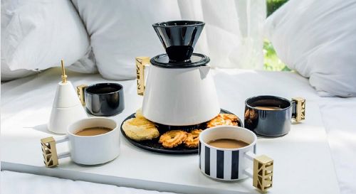 和《流浪地球》联名出品火箭手冲咖啡具套装,上下堆叠的火箭造型,化整为零,九项合一。既是生活实用器,又是空间装饰物。
