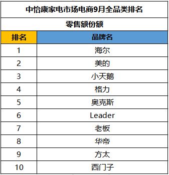 在中怡康9月线上市场全品类零售榜上,几大主流家电品牌零售份额均有所上升。海尔排名第一,美的及旗下小天鹅分列二、三名,格力排名第四。年轻家电品牌Leader也快速闯入前十,上升至第六名。