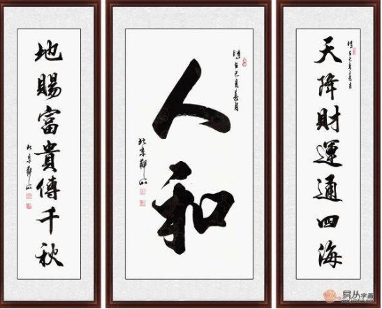 观山老师此幅人和书法,配以对联:“天降财运通四海,地赐富贵传千秋”,正是道出财运、富贵等皆是以“人和”为基础,正所谓:家和万事兴,人和百业旺。非常经典且寓意极好的中堂书法作品。