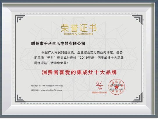 千科集成灶荣获2019年度“消费者喜爱的集成灶十大品牌”