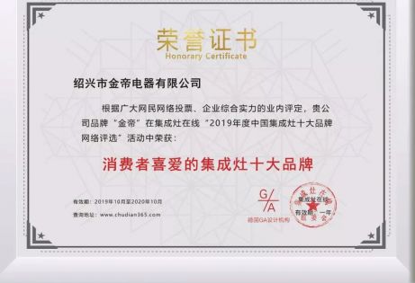 金帝集成灶再次荣获消费者喜爱的集成灶十大品牌!