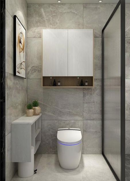 面积不够,墙面来凑,利用如厕区上方的墙面空间,设计一个悬挂式马桶柜,方便储放纸巾、手机。无需大动干戈,摆上一些精致奇趣的装饰小件、绿植香薰,也能让卫浴空间增添趣味!