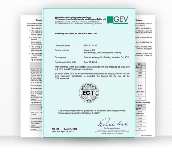 据悉,EC 认证是欧洲最权威的环保认证,也是目前全球范围内对防水涂料要求最严格的环保认证。其中,EC1plus是EC环保标志中的最高等级。EC1plus环保标准模拟人们实际居住的环境测试VOC,比国内环保标准要求更高,更注重人文健康与资源节约。