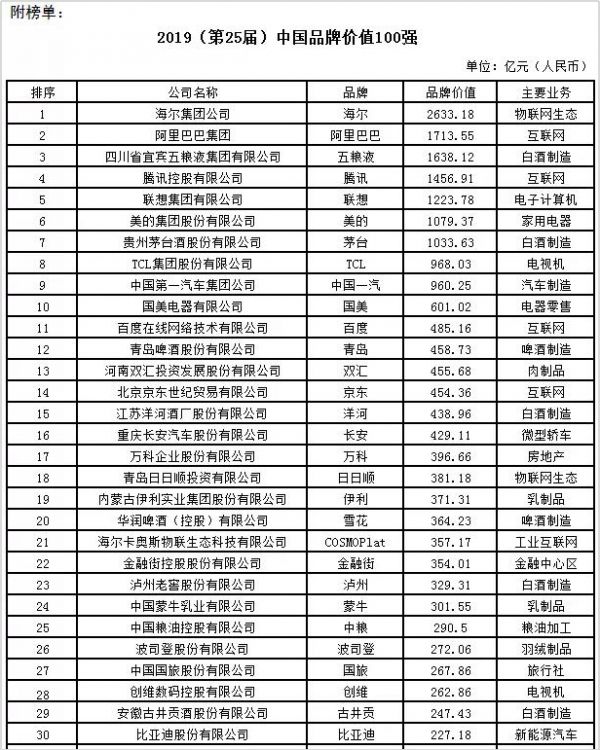 2019(第25届)中国品牌价值100强研究报告部分名单