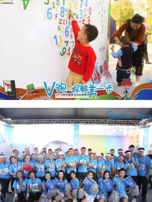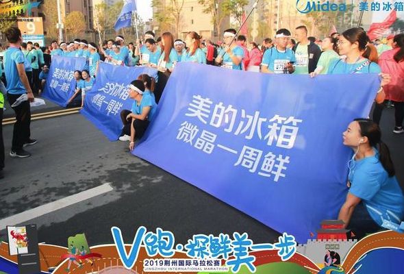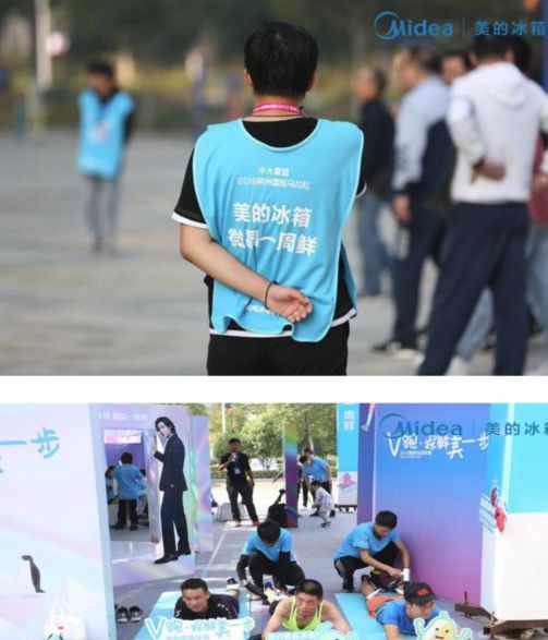 由美的冰箱员工组成的V跑方阵挥旗奔跑,完美展现了美的冰箱的员工风采。赛场的每个角落都洋溢着美的冰箱志愿者领"鲜"一步的精神。
