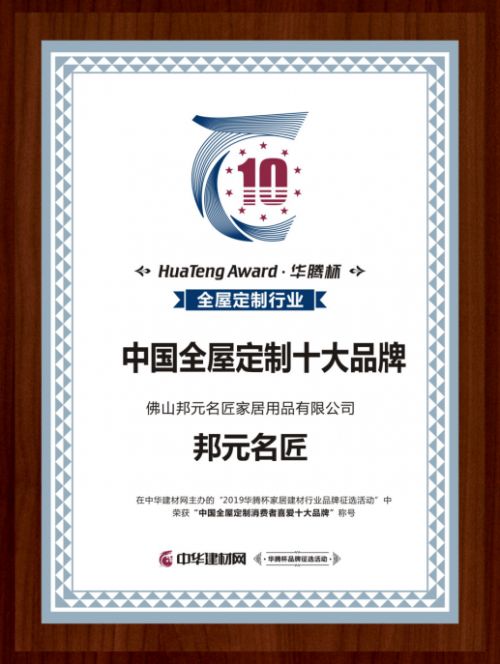 邦元名匠自2004年成立以来,凭借自己的努力以及专业的产品优势征服了广大消费者以及众多加盟商,此次邦元名匠在“中华建材网”重磅打造的首届“华腾杯”2019中国建材行业品牌征选活动中得到了大家的广泛关注和大力支持,一举斩获“中国全屋定制十大品牌”。在不胜枚举的家居品牌中脱颖而出,成为最受消费者喜爱的十大品牌,邦元名匠的综合实力可见一斑。
