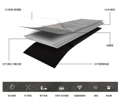 石晶地板的主要成分是钙粉,PVC树脂粉,磨粉料,比例是3:1:1,通过混料机按照原材料配比自动计量,经过热混和冷混均匀混合材料,再经过双螺杆挤出机挤出地板,把耐磨层、彩膜纸和基材通过四辊压延机进行贴合。这个过程不会使用任何的胶水,具有防水、阻燃、防滑、耐污、快速安装的优点。