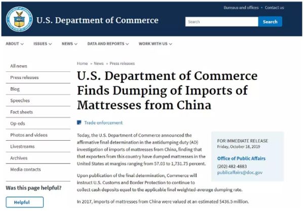 10月18日,美国商务部发布了对中国进口床垫征收倾销税的裁定公告。据公告,恒康家居获得了57.03%的反倾销税率,其他36家征收单独税率的企业,此次核定反倾销税率为162.76%,名单之外的其他床垫家纺企业需要征收1731.75%的反倾销税率。而此前,中国床垫税率为38%。