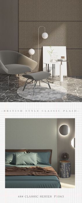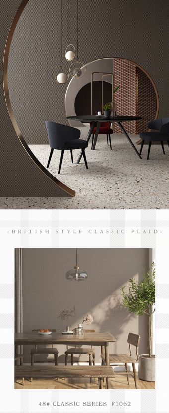 JCC天洋墙布48#经典格纹之F1060、F1063威尔士格纹墙布,将经典复古的流行图案融于墙面艺术中,墙布斜纹和竖纹的交错排列,丰富立体的肌理蕴藏着细节质感,兼容并蓄、沉稳大气,简单的纹路,搭配金属框条、质感沙发及镂空不规则桌椅,为轻奢的家居风格注入几分摩登复古的英伦味道。