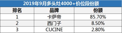 伴随着消费升级,与用户对灶具品质和功能要求的逐步提高,多头灶已成为高端厨电品牌的竞争重点。据中怡康数据显示,9月,在多头灶4000+价位段,卡萨帝份额占比85.7%,西门子份额8.5%、CUCINE2.8%居行业前三。