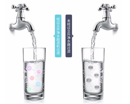 (对比图:经过立升超滤净水器过滤后的净化水VS未经超滤净化的自来水)