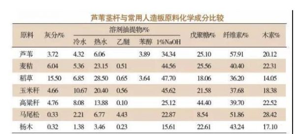 与其它人造板相比,安芯无醛板的主要原材料铁杆芦苇的茎杆化学成分与木材相似,主要包括纤维素、木质素、戊聚糖、灰分和溶剂抽提物等成分,其中芦苇茎杆的纤维素含量达到57.91%,高于松、杉、杨、麦秸、稻草等木质材料。 同时芦苇茎秆的气干密度约为0.57 g/cm³,按木材密度分级标准属中等重,高于松、杉、杨等人工林木材。