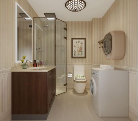 无论是客厅还是餐厅,设计师大面积选用了暖色调,在石膏线背景墙局部加入淡蓝色等冷色调的墙漆配色,使得空间冷暖结合,温馨明亮。卫生间考虑到人多的居住和审美需求,设计师用了仿古砖设计,并且做了干湿分离,实现美感、功能兼具的空间环境,干净整洁。