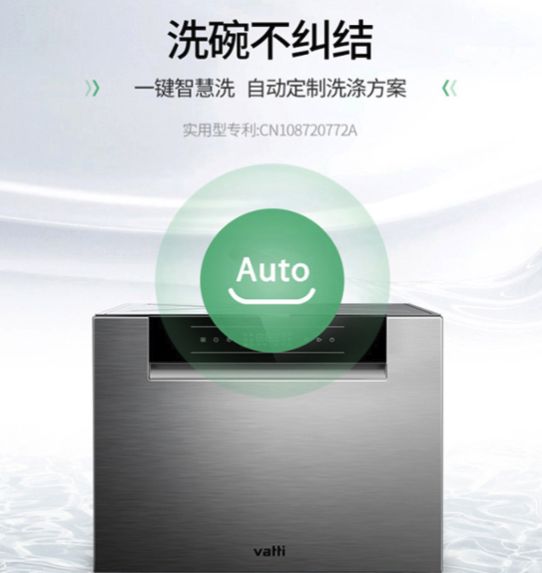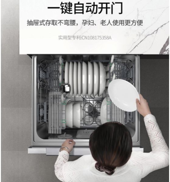 华帝干态洗碗机采取抽屉式存取设计,一键自动开门,也是与消毒柜的人机工程学一致,极大的方便孕妇或老人方便使用(华帝实用型专利:CN108175358A);在设计上,机身更加小巧,能完美匹配嵌入式橱柜的预留空间,其容量可存放50件餐具,属于加强版的8套容量洗碗机,能满足8-10人的家庭人口使用。