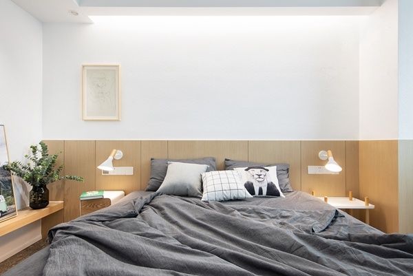 卧室将背景墙与床靠一体化设计,自由延伸的原木丰富着空间的层次感,也为室内带来自然舒适的质感。灰色的床品低调有质感,给人以亲肤的舒适体验。床侧嵌入一块木质隔板,用于摆放装饰画和绿植,无形之中提升着空间的格调。