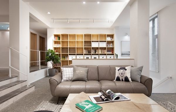 客厅与书房打造成开放式空间,与错层抬高的餐厨、卧室等区域分隔开来,动线流畅,和谐有序。灰色的地面、皮质沙发搭配绿植的使用,使整体空间显得宽敞舒适,自然而不失美感。