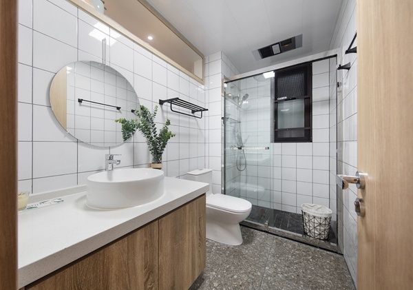 卫生间采用干湿分离,白色的墙砖搭配地面的灰色水墨石,简洁明快,舒适大气。为了从餐厅区域“借光”,设计师巧妙地在干区墙面嵌入玻璃,黄铜包边增加了空间的精致感,与整个空间完美衔接。