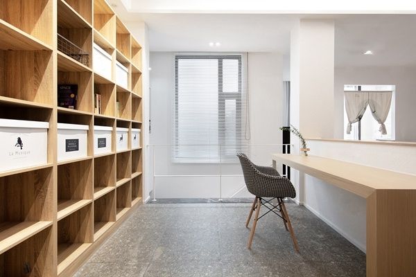 书房背景墙内嵌原木开放式书架,顶面一排轨道灯打造光效,让空间更显温暖亲切。书房与客厅以之间,砌起一面矮墙,一张简易的原木书桌搭配一张时尚的黑白格单椅,尽显简约时尚,舒适实用。