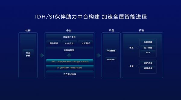 HUAWEI HiLink经过过去3年的生态发展实践,华为深知尊重行业、尊重边界的重要性,为助力全产业更好、更快发展,华为构建两大“中台”:面向海量智能硬件厂商加速HiLink化,打造“IDH(Independent Design House)智能产品赋能中台”。面向地产前装、家装市场打造“SI(System Integrator)全屋智能服务中台”。将华为技术与伙伴资源结合,广泛团结行业力量,优化智能家居产品链条效率,实现共同创新,高效开发,携手共赢。