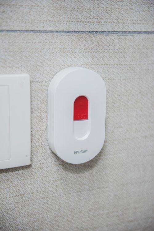 紧急呼叫器距离不小于100mm ,高度距地400~1000mm左右。其位置安排应注意避免在使用扶手或拿取手纸时造成碰伤。为了让老人倒地后仍能使用紧急呼叫器,可加设拉绳,下垂至地面100mm处。
