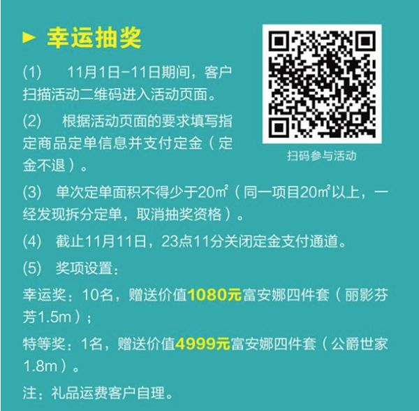 11月1日-11日期间,客户扫描二维码进入活动页面,按照活动页面的要求填写指定商品定单信息并支付定金后,便可获赠抽奖资格。