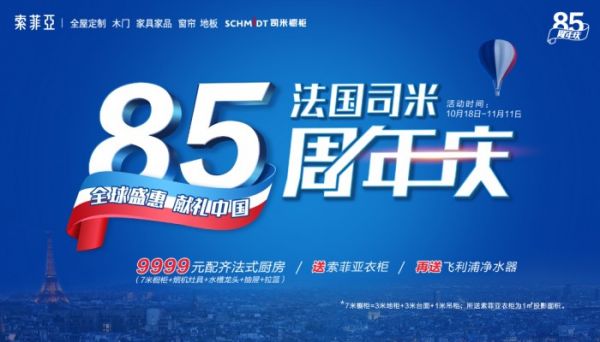 因此为了感谢一路支持、陪伴司米橱柜成长的消费者,借助85周年庆契机,司米全线升级周年特惠,重点推出一价配齐、高性价比的9999元法式厨房!买橱柜送索菲亚衣柜,再送飞利浦净水器!让消费者实现厨房一步到位,拥有高端、原汁原味的欧洲厨房设计,告别简陋厨房!