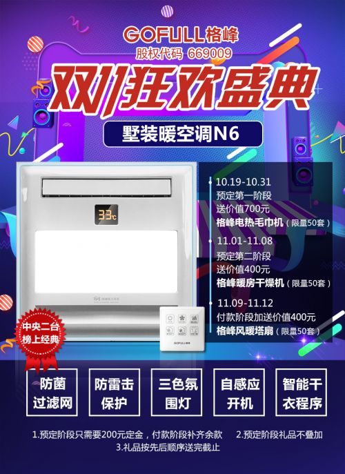 集取暖、干衣、照明、换气、吹风、智能操控等多种功能于一身,格峰墅装浴室暖空调从性能、设计、价值、品质、理念上刷新了消费者对浴室生活的认知。此次双11狂欢盛典格峰墅装暖空调拳头产品N6预定即送,第一阶段10.19-10.31预定即送价值700元的格峰电热毛巾机,第二阶段11.01-11.08预定即送价值400元的格峰暖房干燥机,第三阶段11.09-11.12付款阶段加送价值400元的格峰风暖塔扇,预定就是赚到,格峰电热毛巾机、格峰暖房干燥机、格峰风暖塔扇都是严冬的最佳拍档。