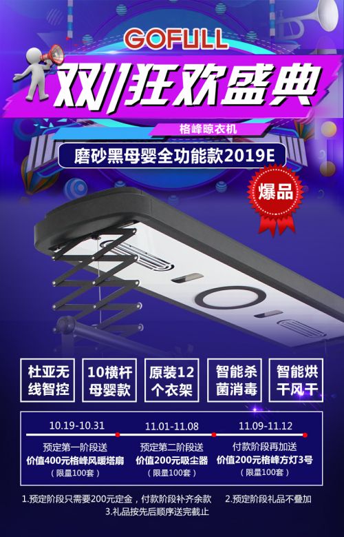 2019格峰全力聚焦厨卫阳台空间,双11狂欢盛典哪能少的了智能晾衣机。此次参加双11狂欢盛典的格峰晾衣机磨砂黑母婴全功能款2019E采用杜亚无线智控系统,一触实现轻松晾衣,10横杆母婴款,不用担心衣服多不够晾,而智能紫外线杀菌,可以高效消毒不损衣物;搭配智能风暖烘干和自然风干,除菌祛潮一步到位,避免衣物晾不干造成二次细菌污染。10.19-10.31第一阶段预定格峰晾衣机磨砂黑母婴全功能款2019E即送价值400元格峰风暖塔扇,11.01-11.08第二阶段预定即送价值200元吸尘器,11.09-11.12付款阶段再加送价值200元格峰方灯3号。