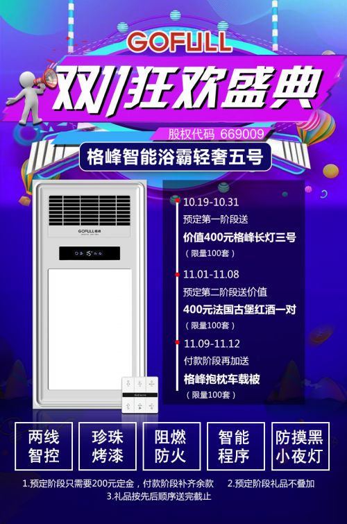 墅装暖空调和智能浴霸随心挑选,除了格峰墅装浴室暖空调N6,格峰智能浴霸轻奢五号同样是浴室的最佳选择,拥有两线智控、珍珠烤漆、阻燃防火、智能程序即防抹黑小夜灯的格峰智能浴霸轻奢五号10.19-10.30预定第一阶段即送价值400元格峰长灯三号,11.01-11.08预定第二阶段即送价值400元法国古堡红酒一对,11.09-11.12付款阶段再加送格峰抱枕车载被。