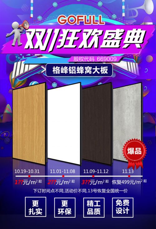 家居吊顶,大板盛行,格峰铝蜂窝大板,航天级板材,硬度及各项性能,超乎你的想象。更扎实、更环保、精工品质,同时给予设计师和用户充裕的DIY空间的格峰铝蜂窝大板一经上市,便受到了消费者的追捧。此次格峰铝蜂窝大板总部分三个阶段开仓大放价,10.19-10.31订购享1??元/m²起,11.01-11.08订购享2??元/m²起,11.09-11.12订购享3??元/m²起,11.13起即恢复全国统一价499元/m²起,越早购买越划算,同时格峰总部给予所有购买大板的用户免费设计。