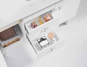 艾菲尔浴室柜柜身的几何线条,细细品味,你能看出设计师为我们创造的线条里的故事:“无论何时、无论何地,我们一定会再次遇见彼此”。线条的微妙变化让产品更添浪漫情怀。