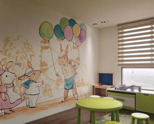 2、 另外一种是针对一些比较特殊的空间进行针对性绘制,比如阳光房可以在局部绘制与太阳、花鸟为主题的画等。