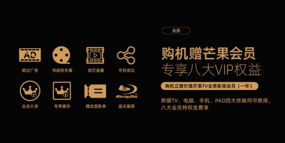 不仅如此,熊猫电视还进一步为广大消费者送上了购机福利。购买熊猫65D7U电视的用户,还能获得熊猫电视准备的一年芒果TV全屏影视会员,可享受跳过广告、热剧抢先看、综艺独播、节目周边、会员片库、专享缓存、赠送观影券、蓝光画质八大会员特权。重要的是,不仅电视端可用,电脑、手机、PAD终端也可以同时享受会员权益。