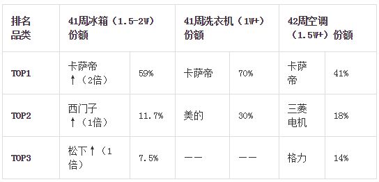 空调42周数据显示,1.5W+产品中,卡萨帝和三菱电机占有6成高端市场。其中卡萨帝云鼎空调均价超过1.7W,能强力净化空气中的PM0.3,时刻打造清新空气;“指挥家”空调可以给老人孩子提供专属送风方案,是高端家庭送风首选;三菱电机同样以过硬的制冷技术受到高端用户青睐,是高端用户心中“质量的保证”。