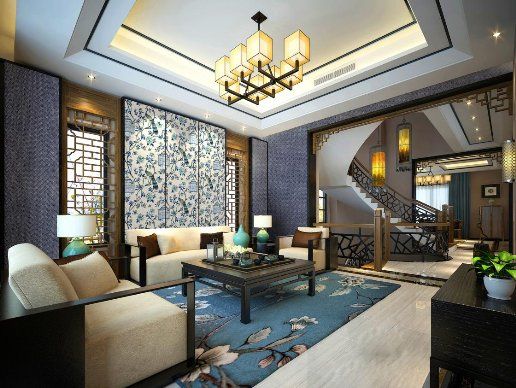 中式风格家装最大的特点是内敛,用含蓄的方式展现家装的精致与奢华。这里设计师没有选用经典的红黄搭配,而是选择使用蓝色系的汇明A+墙布《寻梦·紫禁城》来展现中式装修的意蕴。