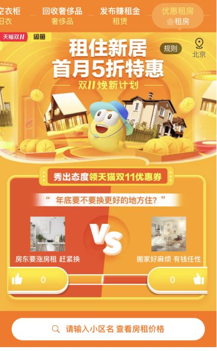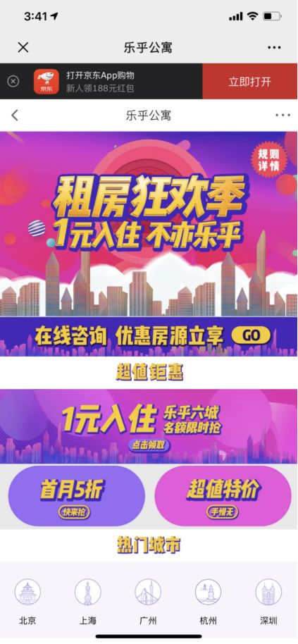 乐乎公寓本次的活动时间为10月26日-11月13日,在全国范围内开展,针对不同城市的特点,人群画像的需求,及数据分析的B端需求,推出了“因地制宜”的优惠政策。闲鱼上大力度推出4563个优惠房源,杭州、深圳、广州、上海、北京都将开展“一元秒杀”、“线下抽奖”等活动;成都、杭州、南京、武汉在活动期间,以年轻人为主要客群,主打潮品概念,推出大力优惠的同时,提供非常年轻、个性、时尚的居住服务与优惠体验。