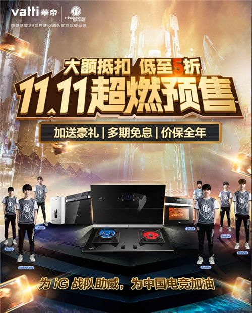 华帝作为中国高端家电品牌的佼佼者,始终关注消费者的使用需求。近几年,不断致力于将智能科技与时尚美观的工业设计、优质的服务体验相结合,为消费者打造智慧、时尚、轻松愉悦的厨房环境。旗下产品科技智慧、造型时尚、省时省心赢得消费者青睐。此次华帝助威iG英雄联盟战队,双十一各大渠道厨卫商品买5免1,足见其对竞技精神的热爱、对消费者的真诚。我们也期待解锁更多华帝与iG战队接下来的合作。