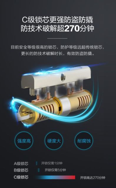 要想家庭安全做的好,小Biu智能门锁不能少。面对主人要轻松解锁,面对坏人也要立刻上锁。关于门锁的危险事件,绝大多数是因为坏人尾随。你以为进了家门就安全,其实传统电子锁在解锁后5-10秒才会重新上锁,给了坏人可乘之机。小Biu智能门锁针对这一现象,进行了安全升级。解锁进门后,门把手回弹立刻上锁,有效防止尾随。除此之外,在锁芯的选择上,小Biu智能门锁采用了高等级的C级锁芯,防技术破解超270分钟,搭配异常报警系统,更强防盗防撬。小Biu智能门锁,给你全方位的家庭安全防护。