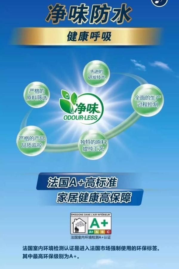 净彩无尘防水组合,产品粉料配方拥有国际发明专利技术(中国发明专利号:ZL2006 8 00410423),净味配方,呵护家人健康。