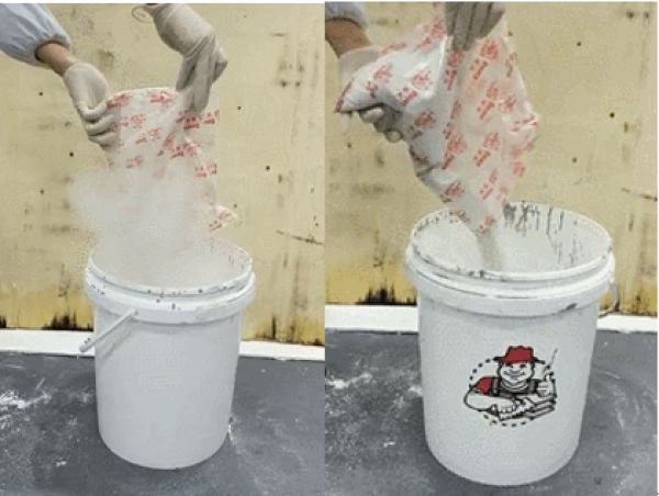 看到没?左边的普通防水产品,倒粉料产生的扬尘实在夸张,对比之下,右边的德高无尘防水的粉料倒出时,抑尘效果很明显。