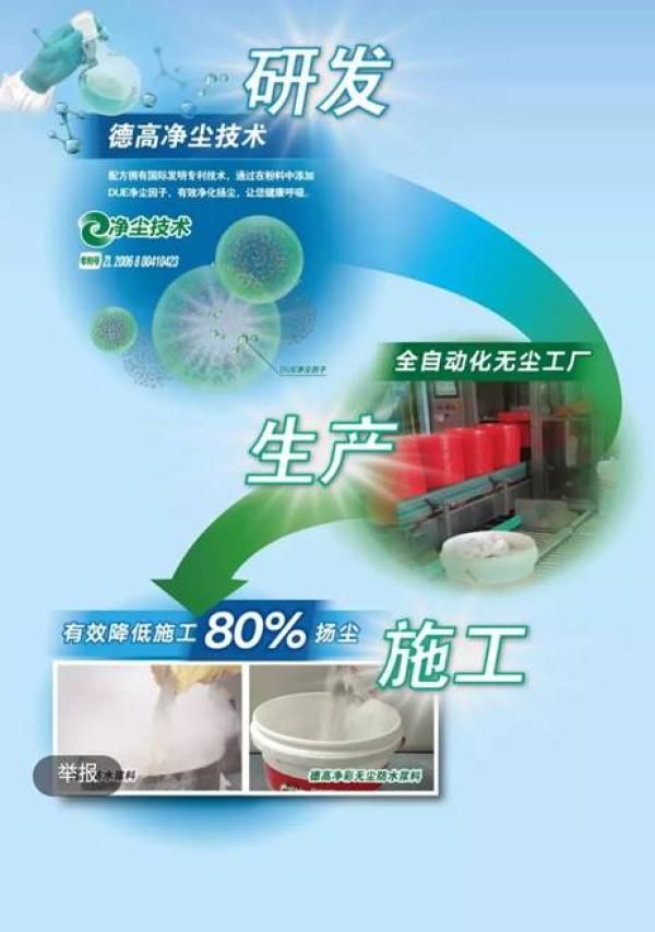 德高K11净彩无尘防水浆料,应用净尘技术产品根据Q/DGJC 11—2018《预拌砂浆抑尘效果的评价方法标准测试》,能有效减少施工现场80%扬尘。