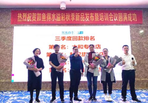 如鱼得水的子品牌溢彩自今年年初成立以来,其势头可谓是突飞猛进。每隔几个月便登出的超级战报让业内人眼红不已,屡屡突破的百万月销售额的记录更是引得整个行业都为之侧目。而着眼于年轻消费群体、以流行风潮为重要参数的溢彩的成功,其实也侧面凸显了如鱼得水长远而又正确的战略眼光。大会上,第三季度销量排行前列的几位经销商们受邀上台,简要分享了自己所取得的成就与秘诀,将现场气氛推向了一个高潮。