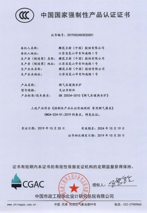 从10月起,购买家电一定要认准3C认证标志了!日前,国家市场监管总局发布通知,自今年10月1日起,所有防爆电气、家用燃气器具和标定容积500L以上家用电冰箱,均需纳入CCC认证管理范围,由国家指定认证机构受理认证委托并根据认证结果出具证书。据了解,20余家通过家用燃气具产品国家强制性认证的公司名单出炉,SAKURA樱花壁挂炉荣列其中,获得CCC认证证书,为消费者的选购提供了更可靠的安全保障。