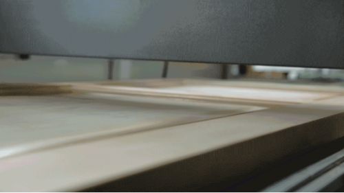 笔者在车间目睹了一扇门的现场快装:预制好的木门各部件在生产线上快速拼装成形,全程无需任何切割,大大减少了粉尘的污染。同时,机械拼装工艺,让木门的品质得到进一步的保障,避免了人工拼装产能低和质量不可控的问题。
