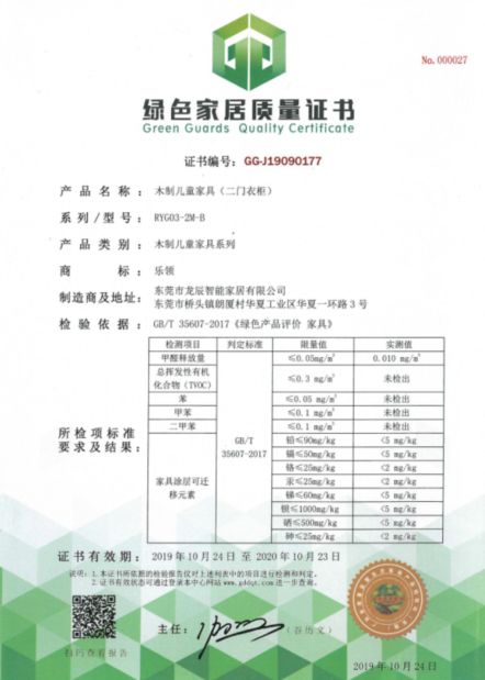 与其他品牌使用小件产品(床头柜)检测不同,本次ROLIN KIDS乐领品牌的检测产品为真正意义上的大件产品(二门衣柜),以GB/T 35607-2017《绿色产品评价 家具》为判定依据,各项数值均代表了权威认证机构对乐领品牌践行绿色发展理念和产品服务品质的认同,同时也完美诠释了ROLIN KIDS乐领品牌“国标是底线,品质无上限”的超高标准要求。