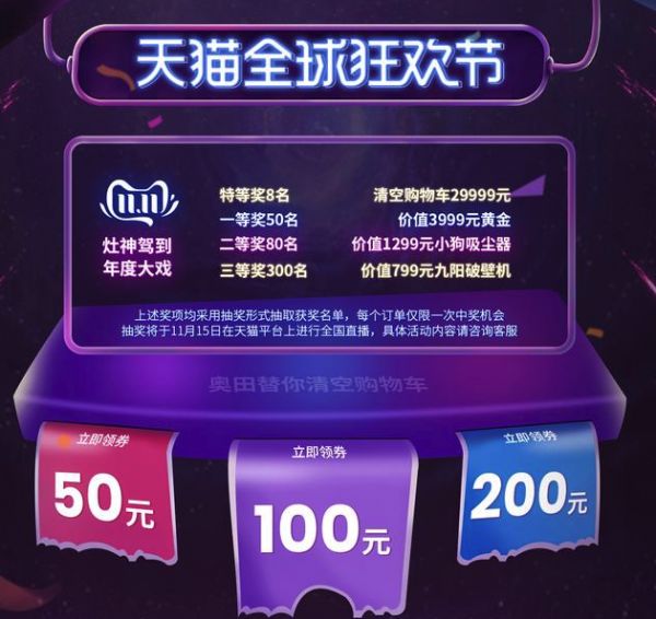 同时,除了拼手速的五折让利,还有拼人品的超级大奖,凡下单者,均有机会抽取价值29999元、清空购物车的超级大奖,多达8个名额哦!另外,一等奖50名,送价值3999元黄金;二等奖80名,送1299元的小狗吸尘器;三等奖300名,送价值799元九阳破壁机。据悉,抽奖结果将于11月15日在天猫平台上进行全国直播,做到公开、公平、公正。