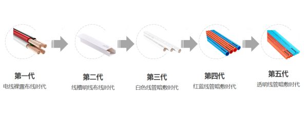 纵观中国线管的发展历程,是伴随着人们生活水平不断提高,而不断的演进与迭代的过程,大致上可分为5个时代:一是从最早的电线裸露布线时代,告别煤油,有灯光照明的感觉真好;二是到了90年初代线槽明线保护时代,人们开始有意识的保护电线,防止过快老化,线槽保护相对电线裸露在美观度上有了进一步的提高;三是到21世纪初白色线管暗敷时代,白色线管在质量上比线槽要好,密封性更高,暗敷相对明线,特别是家装,在美观度上又上了一个新的台阶;四是到了2010年以后,部分有理念的家装公司开始推行强弱电分离,“红管强电,蓝管弱电”,开启了广义上的“红蓝线管”时代,当然有部分家装公司为了差异化,用黄、绿、紫、灰或其它色系搭配,也是属于这一些范畴。强电与弱电分离,可避免强电对弱电信号干扰,便于检修,更加人性化和便捷,安全系数相对来说会更高一些。五是到了2017年左右,开始陆续推出透明线管,红橙黄绿蓝,五彩缤纷,助力大家居时代。