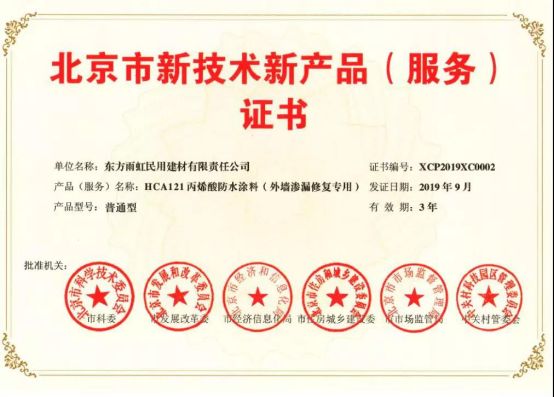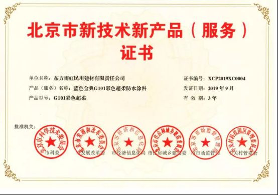 近日,雨虹防水自主研发生产的五款产品,蓝色金典G101彩色超柔防水涂料、雨虹200金标柔韧防水涂料、HCA121丙烯酸防水涂料(外墙渗漏修复专用)、底涂型堵漏宝、B200单组分贴砖伴侣,获得北京市科学技术委员会、北京市发展和改革委员会、北京市经济和信息化局、北京市住房和城乡建设委员会、北京市市场监督管理局、中关村科技园区管理委员会联合颁发的《北京市新技术新产品(服务)证书》。