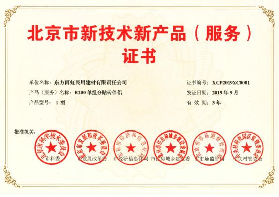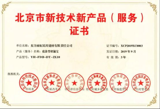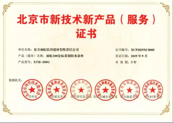 雨虹防水五款产品获得《北京市新技术新产品证书 》